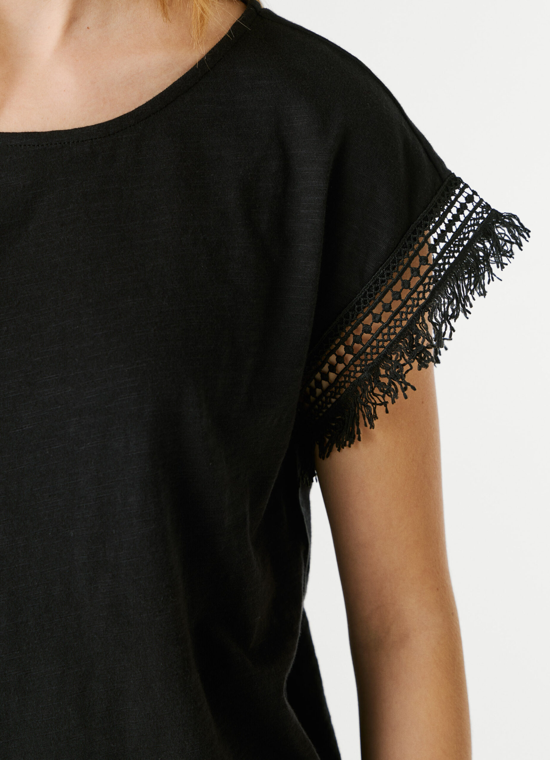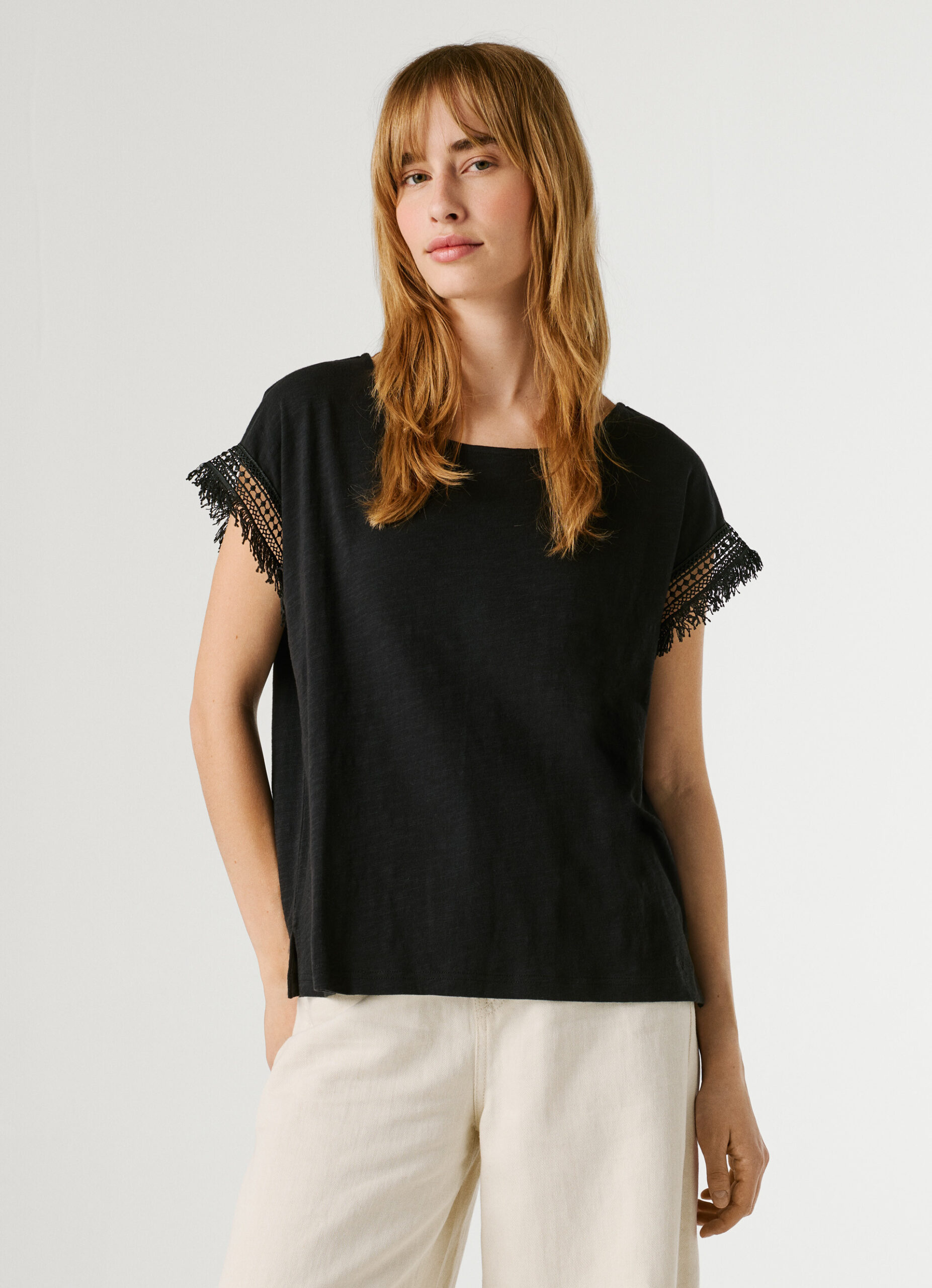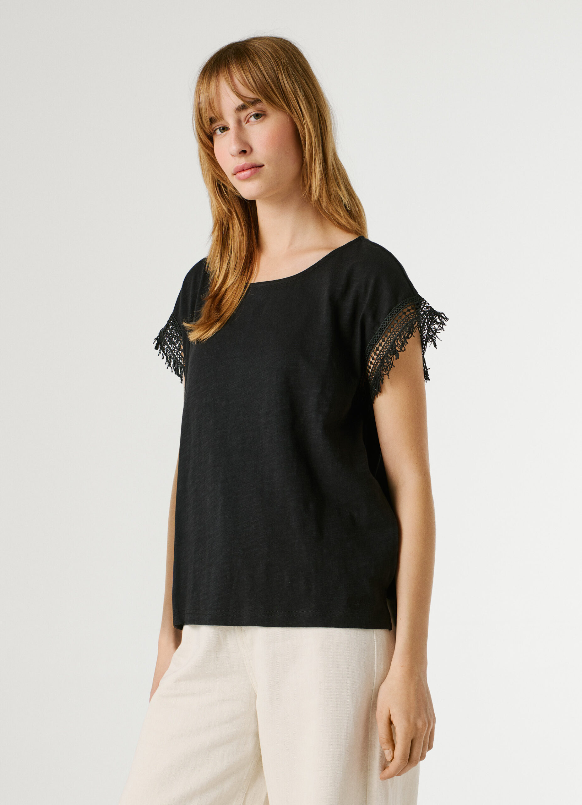 PEPE JEANS CREW NECK T-SHIRT FRINGES BLACK