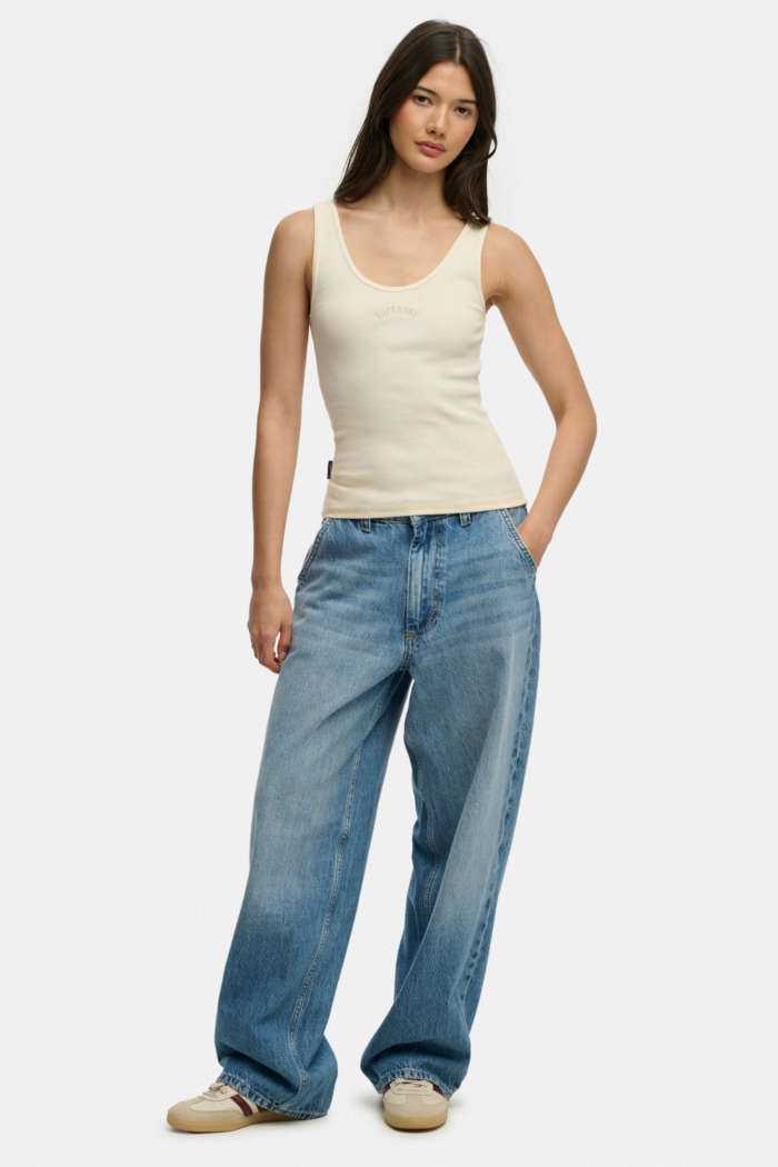 Branding: Subtle Superdry metal logo tab near the hem